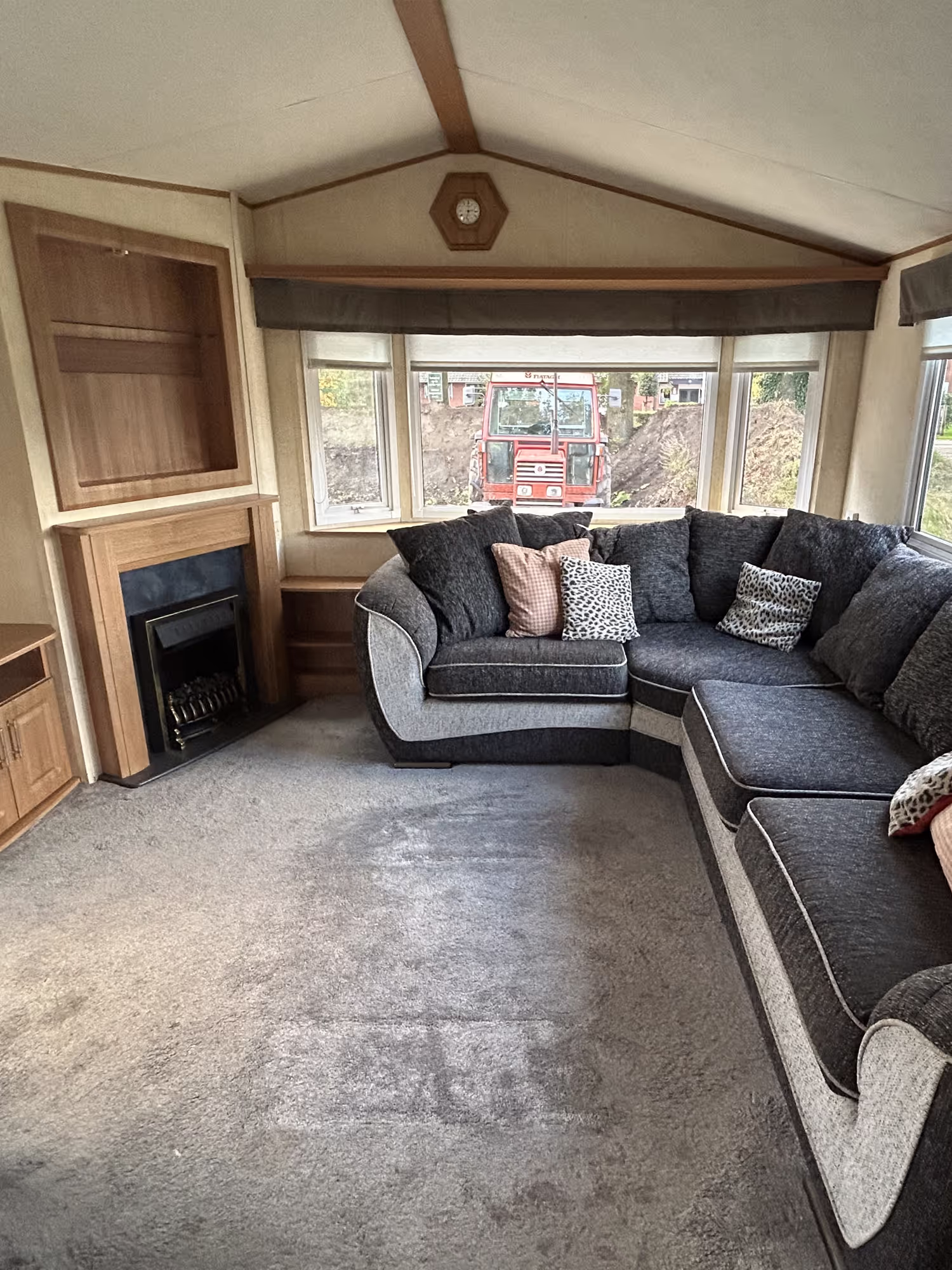 Kenmerken van de Willerby Bermuda zijn een ruime woonkamer, uitgerust met een grote hoekbank, een tv-meubel met kastjes en een gashaard, wat zorgt voor een gezellige en comfortabele leefruimte. De keuken is voorzien van een koelkast, gaskookplaat, grill, oven en voldoende kastruimte, waardoor maaltijdbereiding eenvoudig en plezierig is.